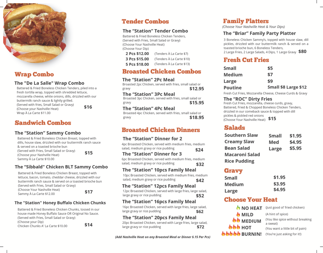 When dining with family or friends, indulge in the Briar Family Party Platter, which boasts an array of boneless chicken sammys, tenders, and sides—perfect for sharing. If you’re in the mood for a sandwich, the Station Sammy Combo features juicy, battered chicken breast enveloped in a toasted brioche bun, drizzled with ranch sauce.